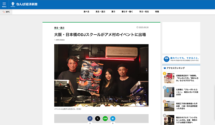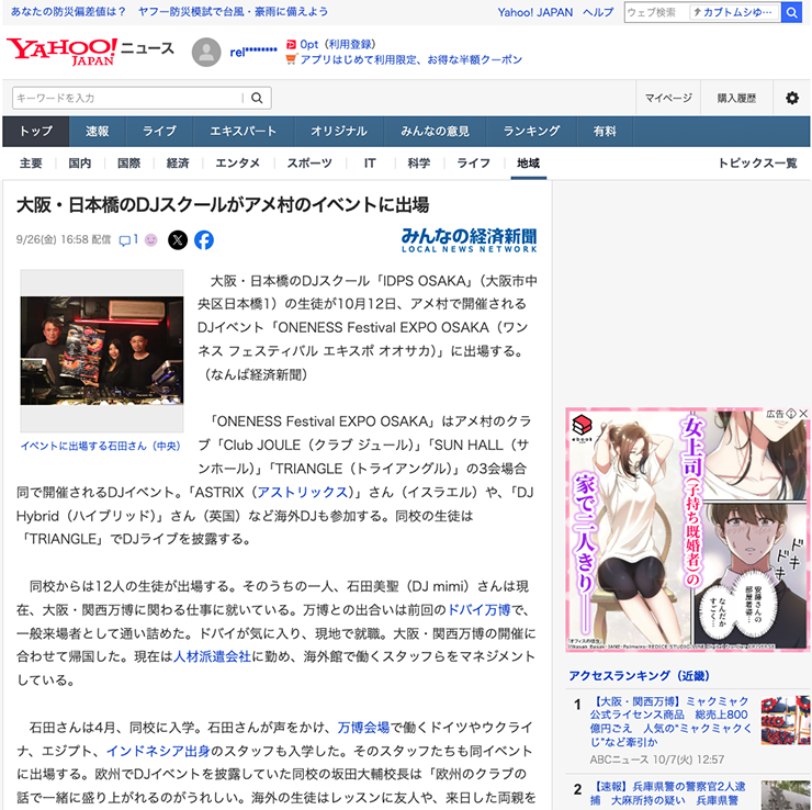 10月12日 (日・祝日前) に、大阪アメリカ村 Club Joule、SUN HALL、TRIANGLE の3会場で開催される音楽イベント ONENESS Festival EXPO Osaka のイベント情報が、なんば経済新聞、Yahoo NEWS に掲載中です。