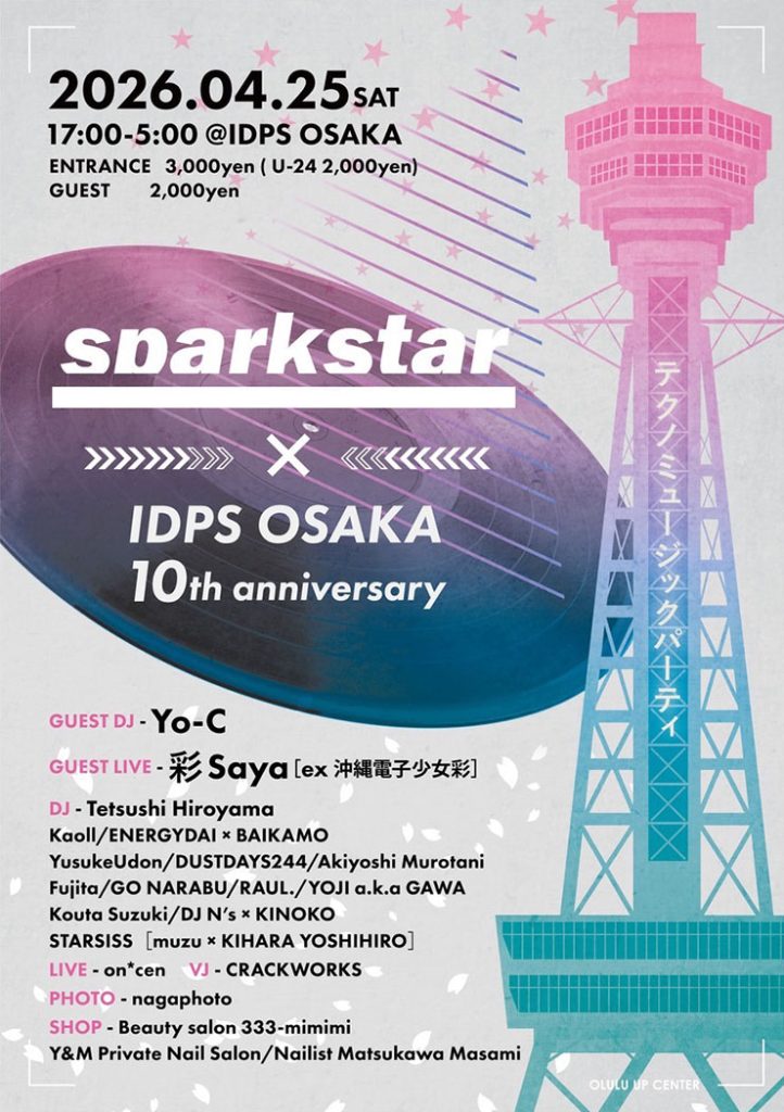 4月25日土曜日に IDPS OSAKA を会場に開催されるテクノパーティ SPARK STAR × IDPS OSAKA 10th ANNIVERSARY のイベント情報は、各種情報サイトよりご確認下さい。